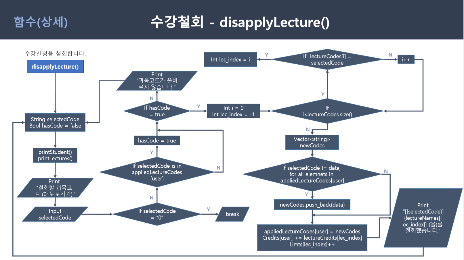 void disapplyLecture(const vector<string>& studentIds, const vector<string>& names, vector<int>& credits, vector<vector<string>>& appliedLectureCodes, const vector<string>& lectureCodes, const vector<string>& lectureNames, const vector<int>& lectureCredits, vector<int>& limits, const int& user);