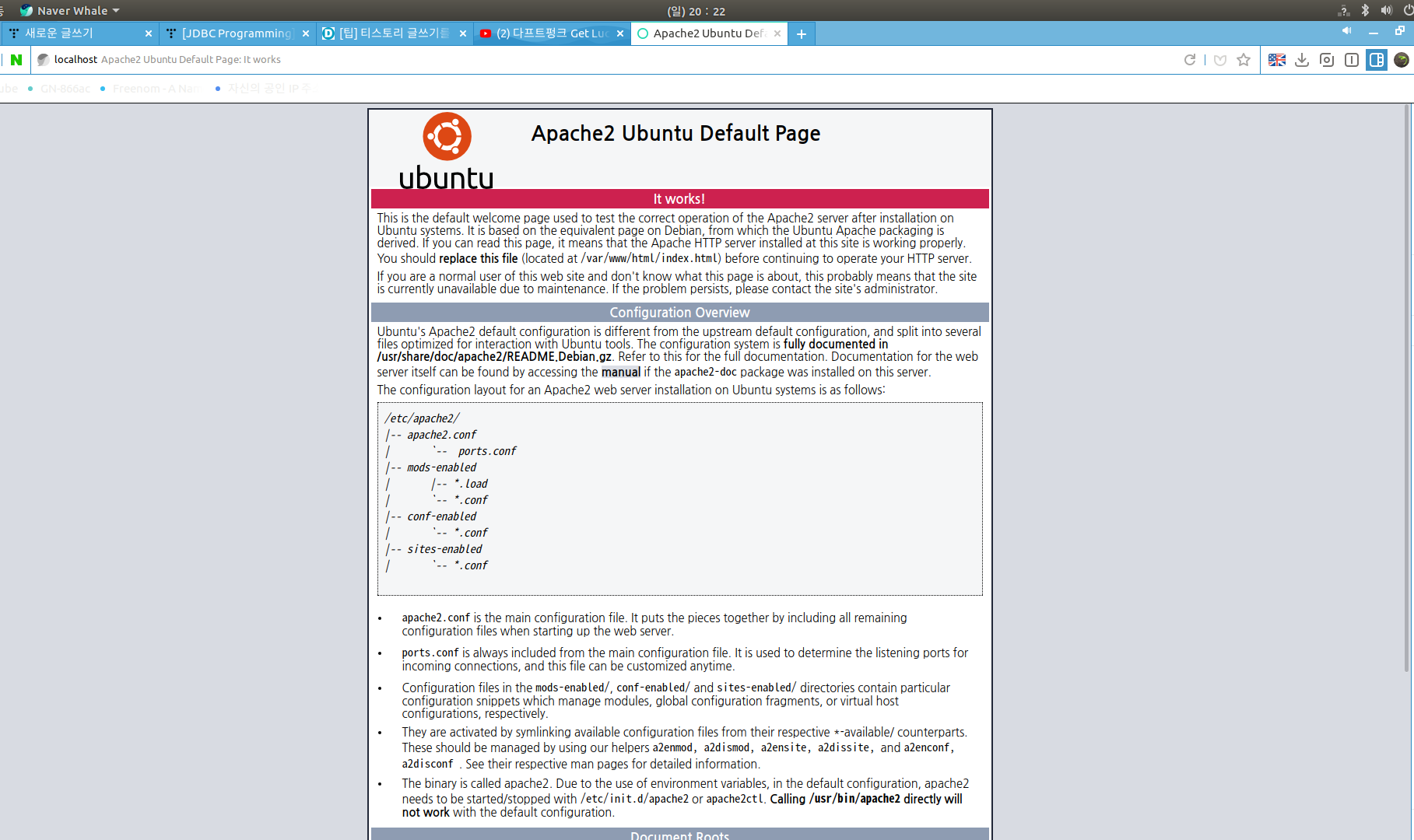 설치를 모두 완료하고 아무 웹브라우저 주소창에 localhost를 입력하면 다음과 같은 화면을 볼 수 있다. 이 화면이 보이지 않는다면 무언가 잘못 설치되었거나 공유기 설정 등에 문제가 있는 것이다.