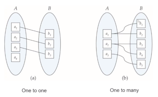 - Many to one: 다수의 개체와 하나의 개체가 관계가 있음. 이때 다른 개체 집합의 원소와 매핑이 안될 수도 있음