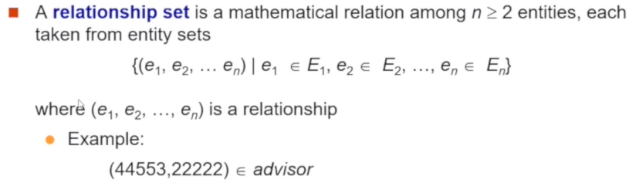 관계 집합은 다음과 같이 개체 집합과 개체 집합 사이에 나타낼 수 있으며, 관계 집합 스스로 속성을 가질 수 있다. 맨 위의 관계를 보면 Crick 이라는 교수가 Tanaka라는 학생의 지도교수이며, 2008년 3월 3일부터 지도교수가 되었다는 의미이다.