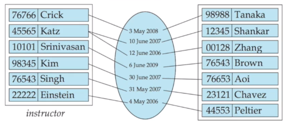 - Many to many: 다수의 개체와 다수의 개체가 관계가 있음. 마찬가지로 다른 개체집합의 원소와 매핑이 안될 수도 있음