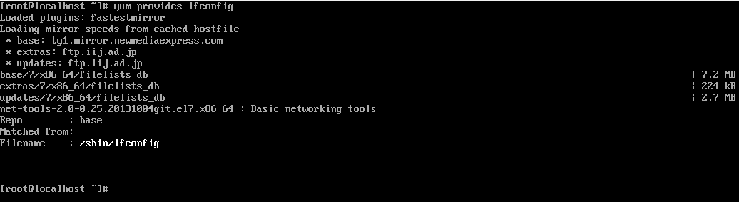 중간에 보이는 net-tools-2.0-0.25.20131004git.el7.x86_64 라는 패키지가 ifconfig 명령어를 포함하는 것을 확인했다.